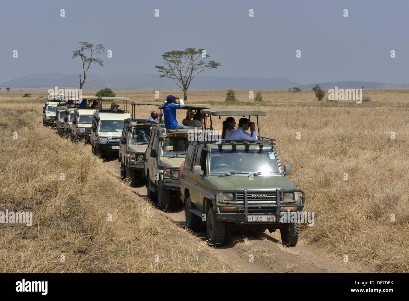 Lined Up Safari Vehicles With Tourists Serengeti National Park Serengeti Tanzania Stock Photo Alamy
